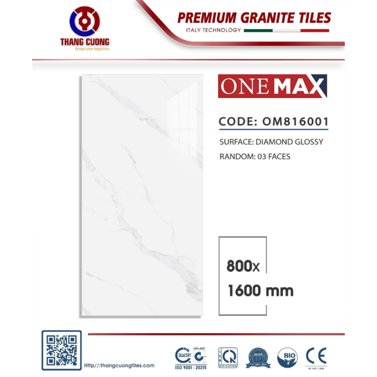 • Gạch 800x1600 mã OM816001 thuộc dòng Granite cao cấp, bề mặt Diamond Glossy siêu bóng sang trọng, họa tiết vân đá trắng tự nhiên sắc nét. Kích thước lớn 800x1600 mm giúp không gian rộng thoáng, đẳng cấp, hạn chế ron gạch. Phù hợp lát nền phòng khách lớn, sảnh, biệt thự, showroom cao cấp tại Xuân Lộc – Đồng Nai.