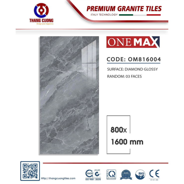 Gạch 800x1600 OM816004 thuộc dòng Premium Granite Tiles – Italy Technology, chuyên dùng cho các công trình cao cấp. Tông màu xám đậm phù hợp phong cách hiện đại, luxury, industrial và tối giản.