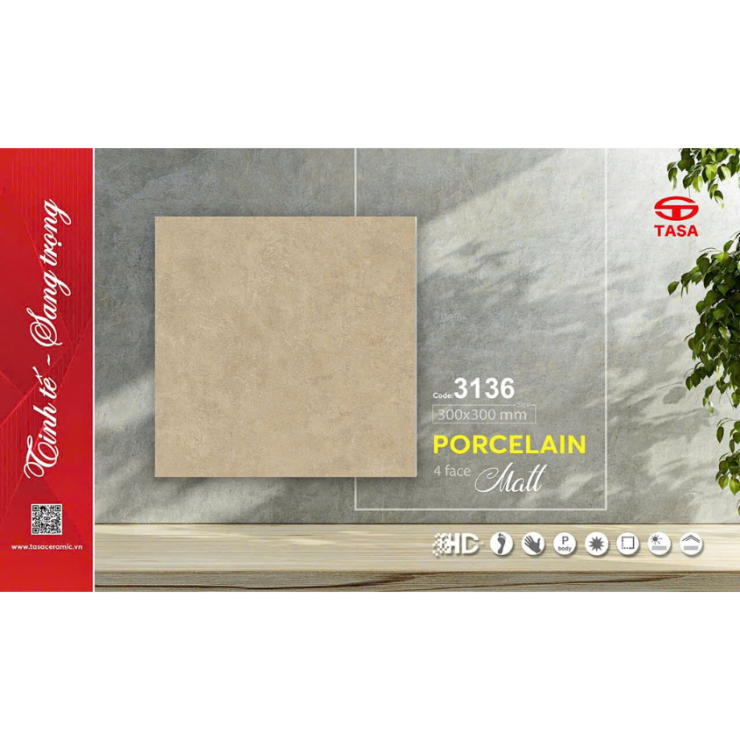 Gạch porcelain matt màu kem TASA 30x30 mã 3136 mang đến cảm giác ấm áp, nhẹ nhàng và tinh tế cho không gian sống. Tông màu kem trung tính giúp không gian trở nên sáng hơn, rộng rãi hơn và dễ dàng kết hợp với nhiều phong cách nội thất khác nhau.