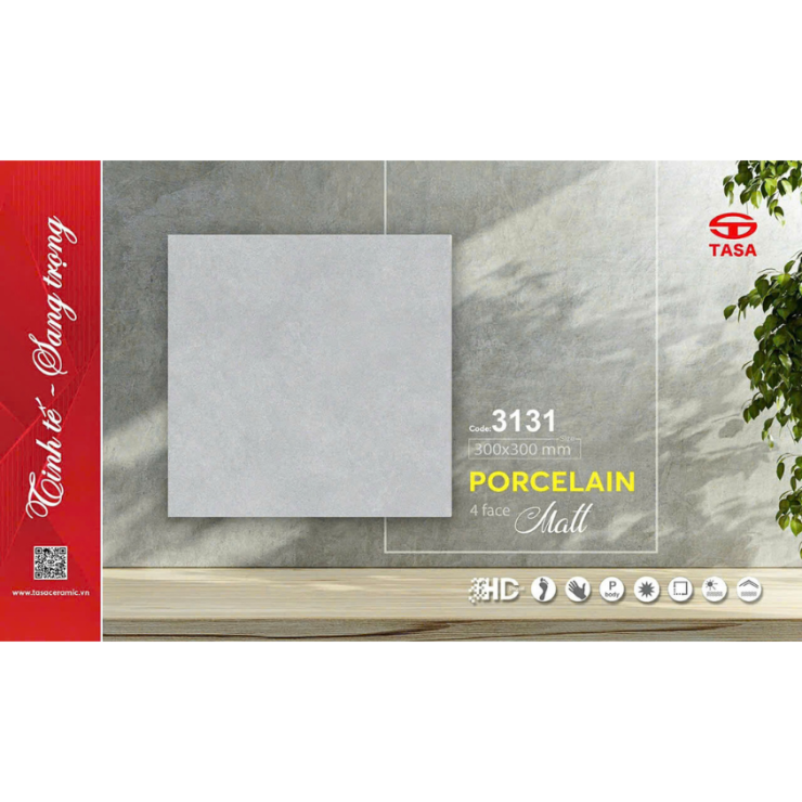 Gạch porcelain matt màu xám nhạt TASA 30x30 mã 3131 mang phong cách hiện đại, tối giản và dễ ứng dụng cho nhiều loại không gian. Gam xám nhạt trung tính giúp sàn nhà trông sạch sẽ, thoáng đãng và dễ phối với nội thất gỗ, kim loại hoặc tone sáng.