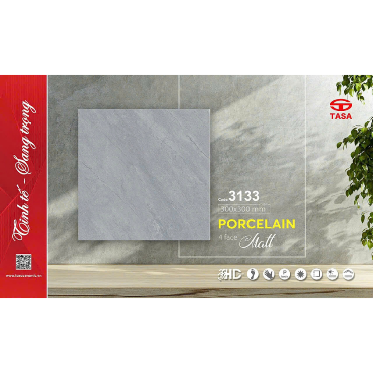 Gạch porcelain matt xám TASA 30x30 mã 3133 là lựa chọn phù hợp cho các công trình yêu cầu sự tinh tế, bền bỉ và an toàn khi sử dụng. Gam màu xám trung tính kết hợp vân đá nhẹ mang lại cảm giác sang trọng, sạch sẽ và dễ dàng phối hợp với nhiều phong cách thiết kế nội thất.